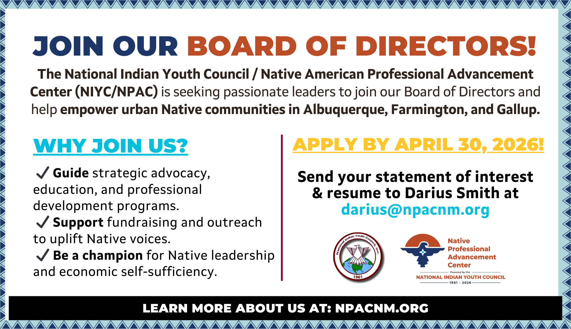 The National Indian Youth Council/Native American Professional Advancement Center (NIYC/NPAC) is seeking dedicated and passionate individuals to join our Board of Directors. As a unified organization, we are committed to serving urban Native communities in Albuquerque, Farmington, and Gallup through advocacy, education, and professional development.